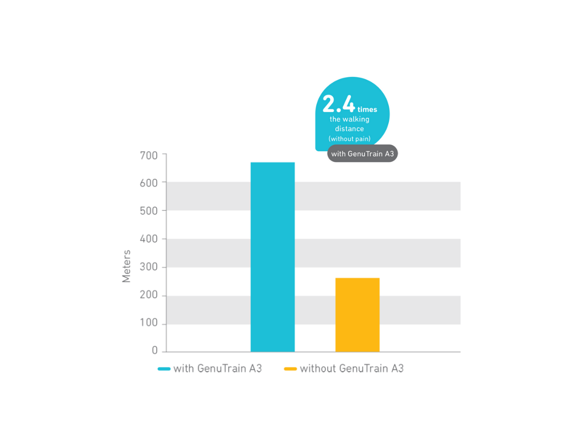 GenuTrain A3 significantly reduces pain and improves stability in patients with osteoarthritis of the knee, as determined through measurement of pain-free walking distance 6 weeks following use of the brace.